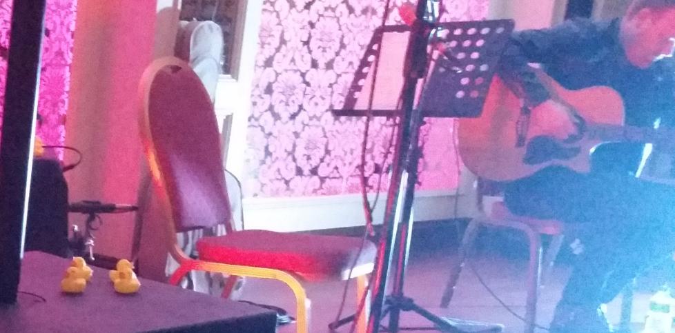 Then Clive came up on stage, and with aplomb set about placing little plastic ducks, all over the place, four on a speaker, three on another and one on the mixing board.